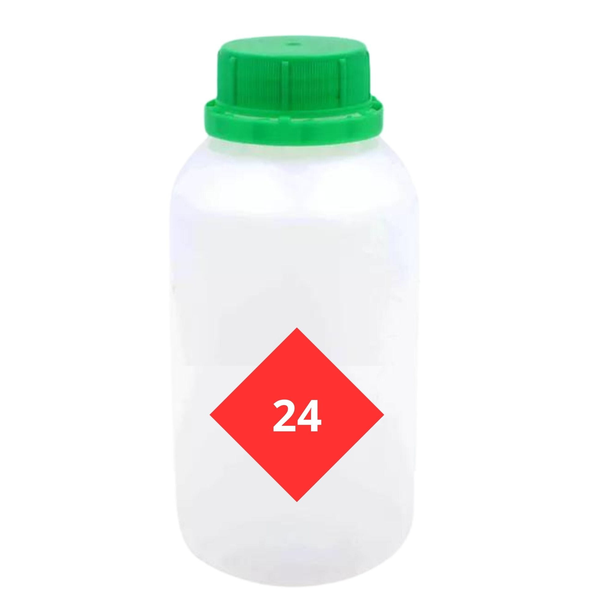 Butelka została wykonana z HDPE/PEHD, co zapewnia wysoką trwałość oraz odporność na uszkodzenia mechaniczne i działanie chemikaliów. Materiał ten charakteryzuje się również skalą wytrzymałości chemicznej od 0 do 1000, gdzie wartość 0 oznacza brak reakcji z odczynnikami chemicznymi, a 1000 oznacza odporność na czysty odczynnik chemiczny.