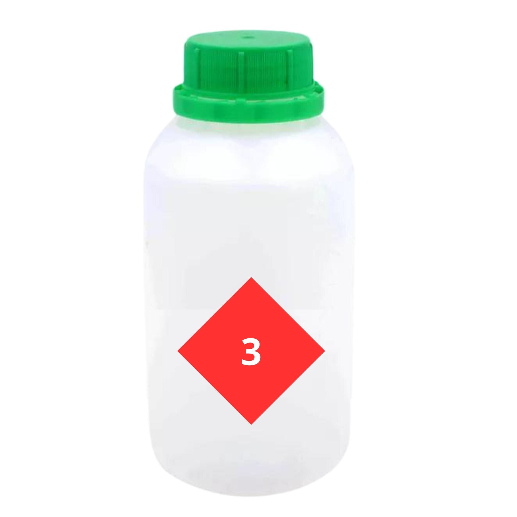 Butelka została wykonana z HDPE/PEHD, co zapewnia wysoką trwałość oraz odporność na uszkodzenia mechaniczne i działanie chemikaliów. Materiał ten charakteryzuje się również skalą wytrzymałości chemicznej od 0 do 1000, gdzie wartość 0 oznacza brak reakcji z odczynnikami chemicznymi, a 1000 oznacza odporność na czysty odczynnik chemiczny.